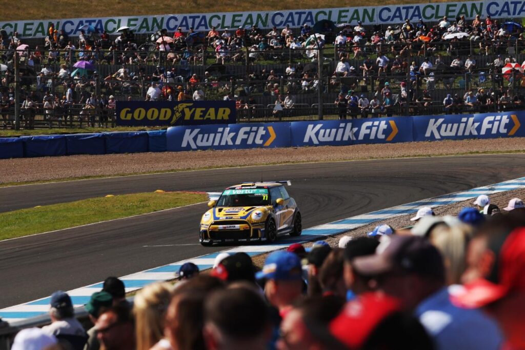 Racing resumed with thirteen minutes remaining, as Jamie battled with Owen Hillman (Pro Alloys Racing). By the time the clock had counted down to eight minutes, Jamie had guided the number 77 Mini JCW Sport by Hillman and Harry Hickton (Mannpower Motorsport), with a brilliant overtaking move on the latter through the chicane to join a four-car battle for second place.